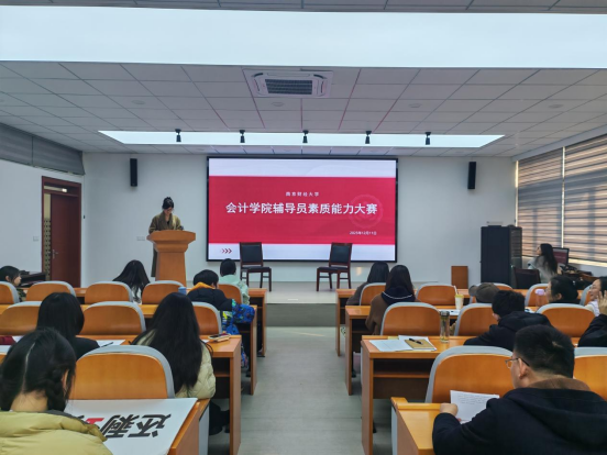为落实立德树人根本任务,推进辅导员队伍专业化、职业化发展,锤炼其理论素养与实战能力,2025年12月11日下午,会计学院辅导员素质能力大赛院级选拔赛在德济楼308会议室成功举办。学院15位辅导员全员参赛,以赛促学、以赛促练,展现了新时代高校辅导员昂扬向上的精神风貌与扎实过硬的职业素养。